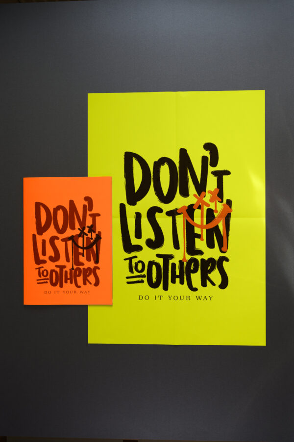 At the very heart of the brochure lies a surprise — a bold, unapologetic poster printed in UV offset, inserted like a spark of rebellion waiting to be discovered. It mirrors the headline from the cover, reinforcing the message: DON’T LISTEN TO OTHERS — DO IT YOUR OWN WAY. This is more than just a printed extra — it’s a manifesto disguised as a design object.