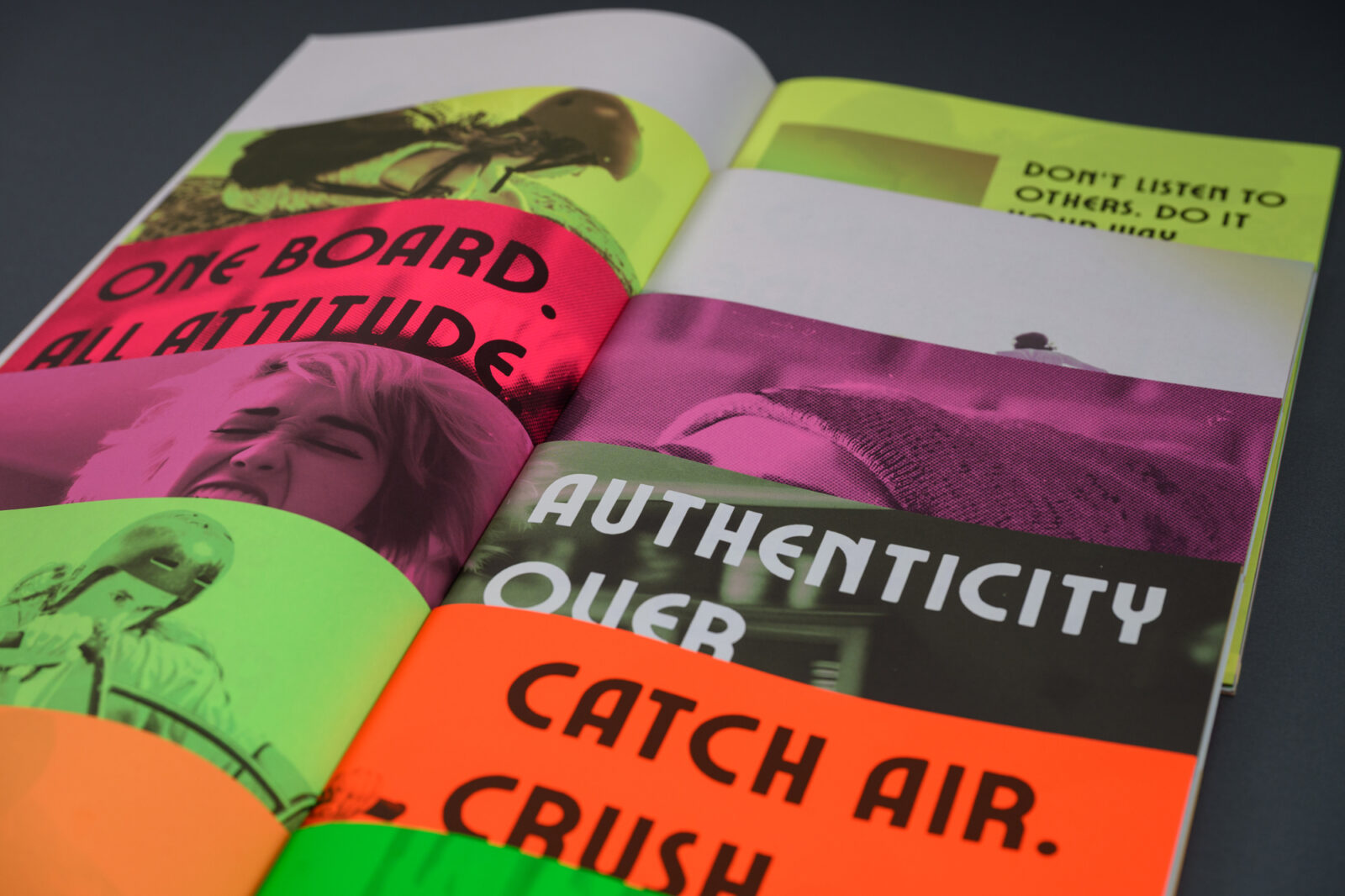 The brochure demonstrates that neon isn’t limited to black-only print. With both one-color and four-color printing showcased, it becomes clear that neon can support complexity — and even subtlety — without losing its energy.