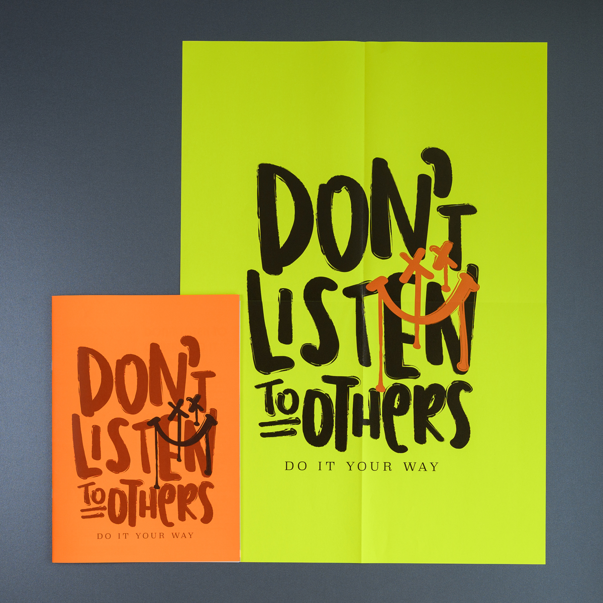 At the very heart of the brochure lies a surprise — a bold, unapologetic poster printed in UV offset, inserted like a spark of rebellion waiting to be discovered. It mirrors the headline from the cover, reinforcing the message: DON’T LISTEN TO OTHERS — DO IT YOUR OWN WAY. This is more than just a printed extra — it’s a manifesto disguised as a design object.
