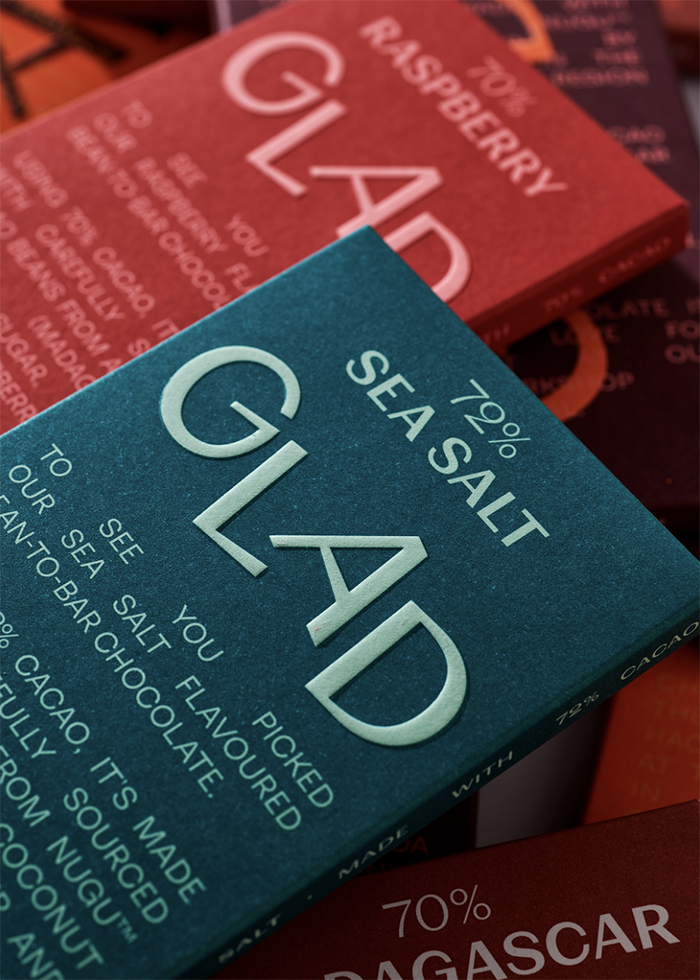 VOLTA STUDIO was commissioned to create a new, fresh visual identity and packaging for GLAD, a carefully sourced bean-to-bar chocolate that focuses on transparency to reach its main objective: making us feel good and happy. For GLAD, gladness comes from being true and real, so every ingredient, origin, and detail matters to create the finest bean-to-bar chocolate.