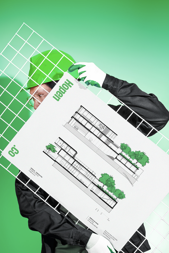 The logotype, featuring the Hopen Sans brand type and a three-dimensional logomark, is a powerful symbol of the brand’s architectural prowess. Its minimalist yet impactful design exudes familiarity and memorability while offering versatility across various applications. Complemented by a contemporary green-black-gray color palette, the visual identity exudes modernity and strength, with green symbolizing the convergence of technology and nature.