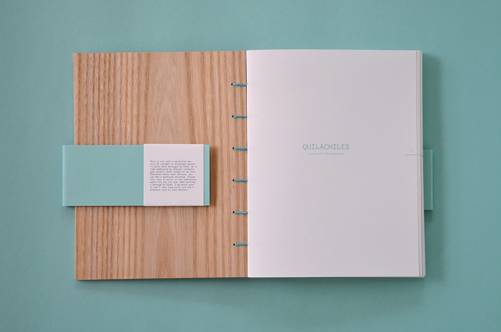 Lisa explains it was important to her to think about every tiny detail and tell more about herself as a person than just her work in the portfolio. The wooden cover expresses her love for nature and the optic binding represents a passion for hand made techniques. Lisa’s portfolio does not only display her work but is also an attempt to encourage people to write more messages by hand. After each project, a postcard with a representative image of the shown projects is attached. She included transparent pages with the suggestions about whom to send the message to. This was done in order to bring more spontaneity and variety into the book. It also represents her never-ending curiosity to try out something new and get to know new territories.