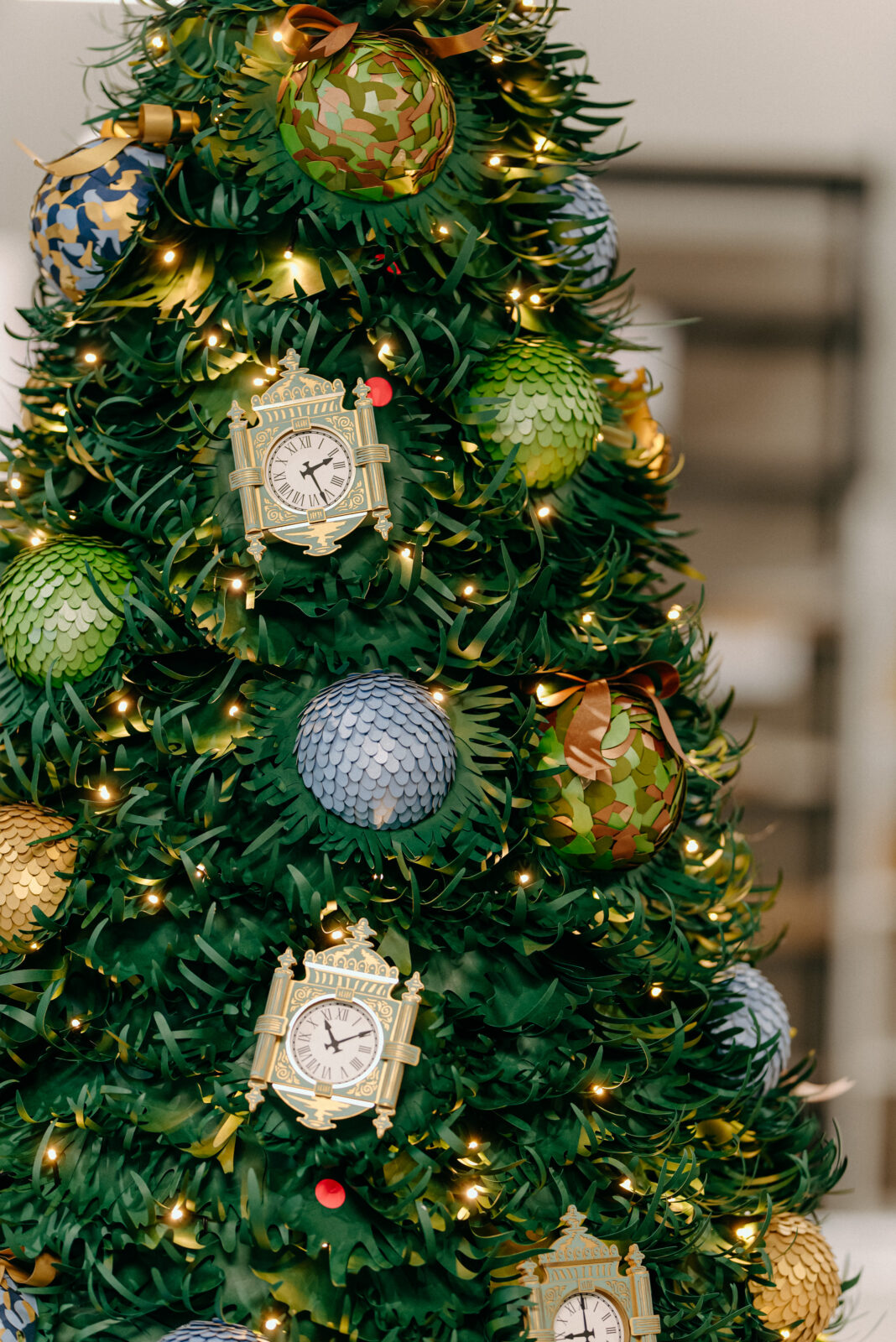 From there, the narrative gently transitions into one of Chicago’s most beloved holiday spaces: The Walnut Room. Bathed in a warm, inviting glow, the legendary Great Tree rises through multiple levels, its branches alive with elves busily preparing for the season. Tucked playfully among ornaments inspired by Macy’s own heritage, visitors can spot the familiar silhouette of Uncle Mistletoe, a detail that rewards those who linger and look closely.
