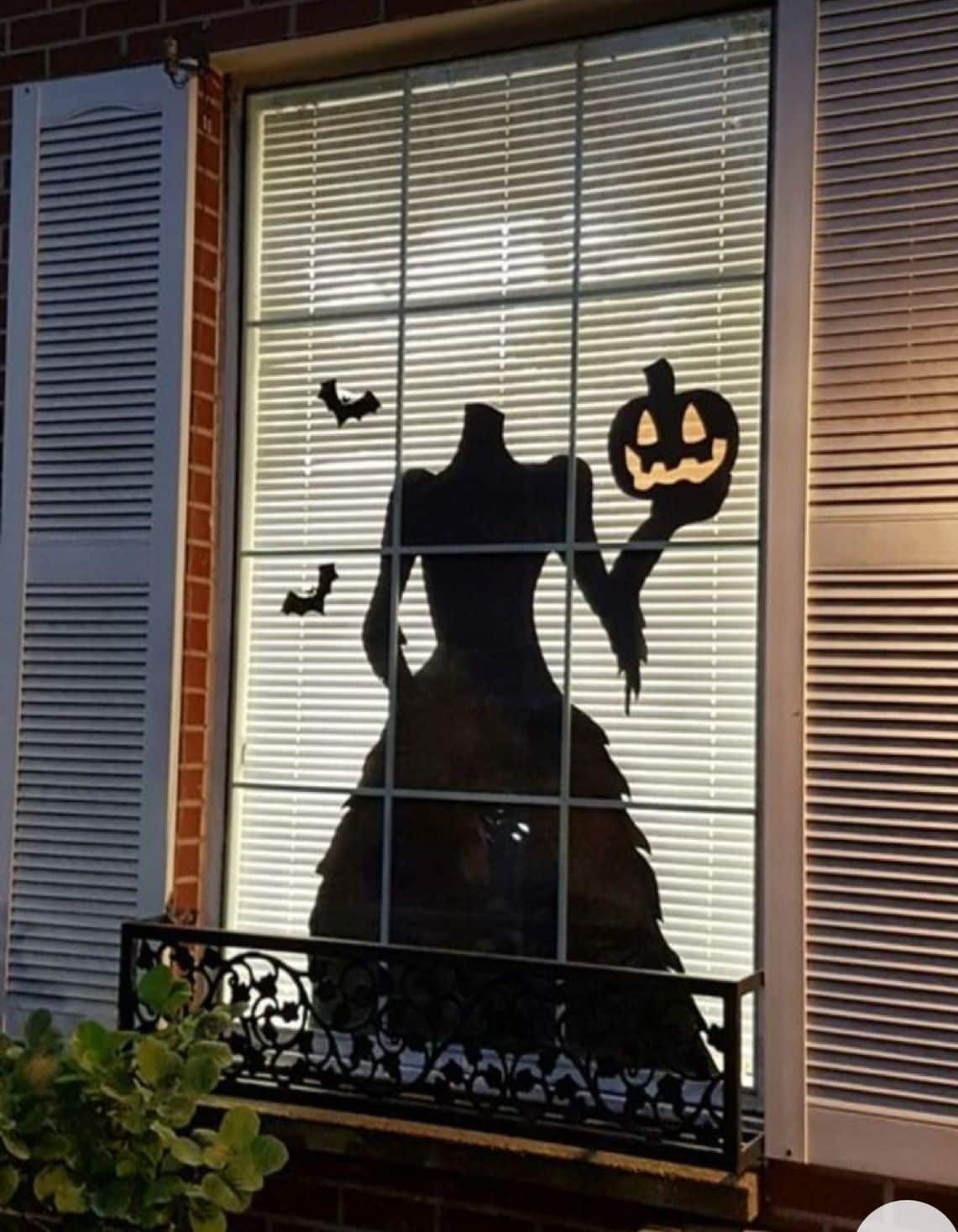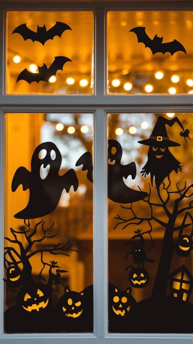 Turn your windows into a theatrical stage. Layer black paper cutouts of bats, cats, and trees between sheets of translucent tracing paper or tissue to create depth and mystery. Backlight them with warm LED light for a cinematic glow visible from outside. The result: moody, minimalist, and infinitely customizable.