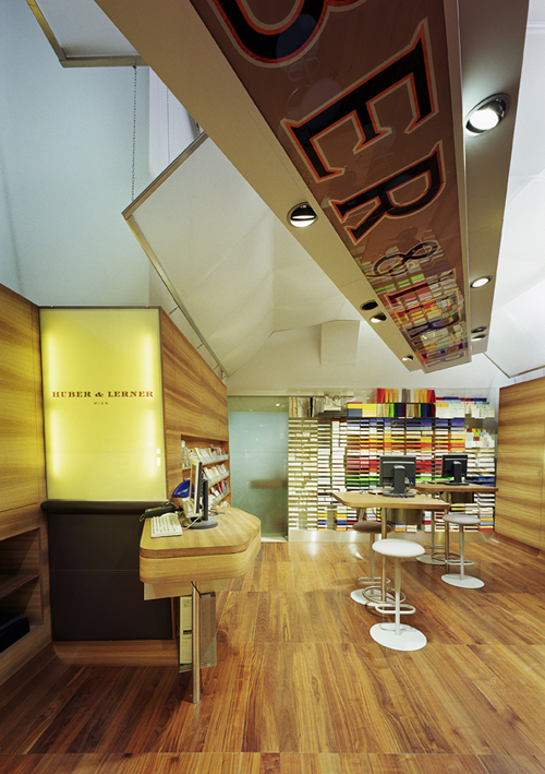 Our shop was designed by the architects Eichinger oder Knechtl. We wanted to get a stylish but at the same time timeless design, which also had to be functional, because there is only a rather small amount of available space at our location. Furthermore one task for the architects was to express somehow the connection to a printing studio – that is why they choose to shape the floor with rounded edges, according to a print roll.
