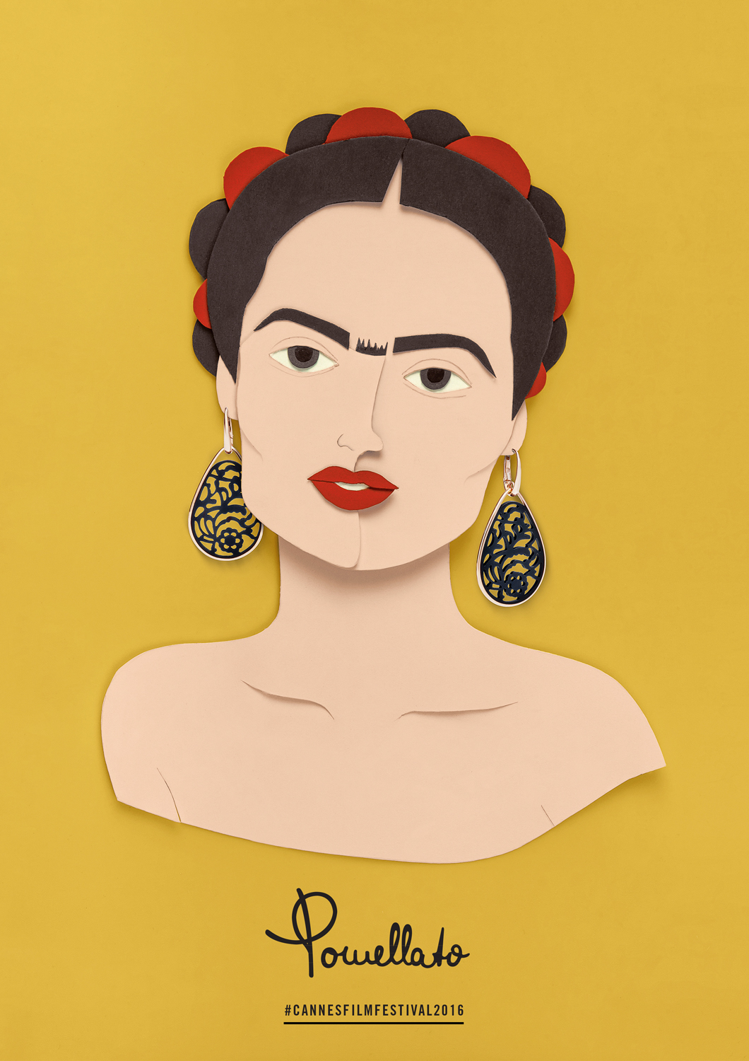 Alessandro Polia and Antonio Zuddas from the agency The Big Now, commissioned paper artists from the studio Apha Design and photographers of Arec Studio to make posters and portraits for the Festival de Cannes 2016, for the Italian jewelry brand Pomellato (which celebrates the image of the self-confident women since 1965). These 3 portraits show 3 charismatic actresses: Salma Hayek (in Frida Kahlo), Catherine Deneuve (in Belle de Jour) and Audrey Tautou (in Amelie), all created from 3D collages and cut paper. Combining softly textured paper with beautiful, elegant Pomellato jewelry, the iconic actresses are dressed for the red carpet.