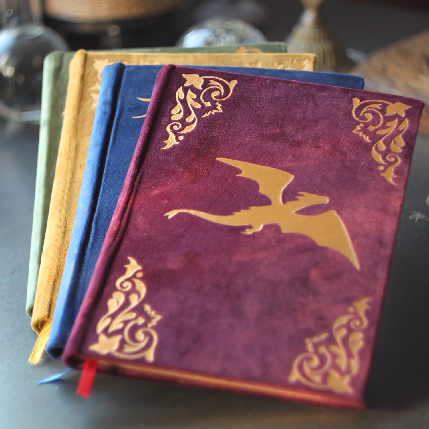 A red notebook in a velvet binding, decorated with a golden dragon and a knight. For brave and passionate people – ideal for motivational journaling, working with emotions and writing your own story.