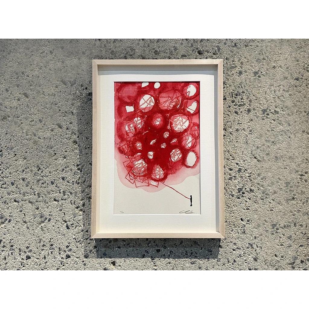 The limited edition Red Circles is part of the trio of Japanese woodcuts Connected to the Universe by Chiharu Shiota, which follows her large-scale installations made of red threads. Here, threads connect the universe within us and around us with red waves, lines and circles. The woodcuts are printed from cherry boards on traditional Japanese handmade Washi paper, produced using the more than 2000-year-old method from the bast of mulberry bushes.