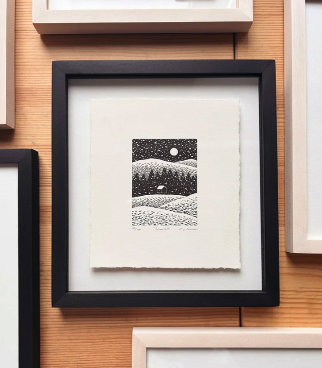 The print ‘Winter Night’ is inspired by the snowy winter nights of Canada. The artist loved sheltering inside and watching the snow fall past the windows. Jay Caskie is a printmaker based in Cornwall, UK, who specializes in relief printmaking and primarily works in wood engraving and collage. His work is inspired by the vastness of the Canadian landscapes where he grew up and the rugged beauty of the Cornish coastline where he lives now. He create intricately detailed landscapes that explore themes of home, solitude, and our intrinsic connection to the natural world and each other.