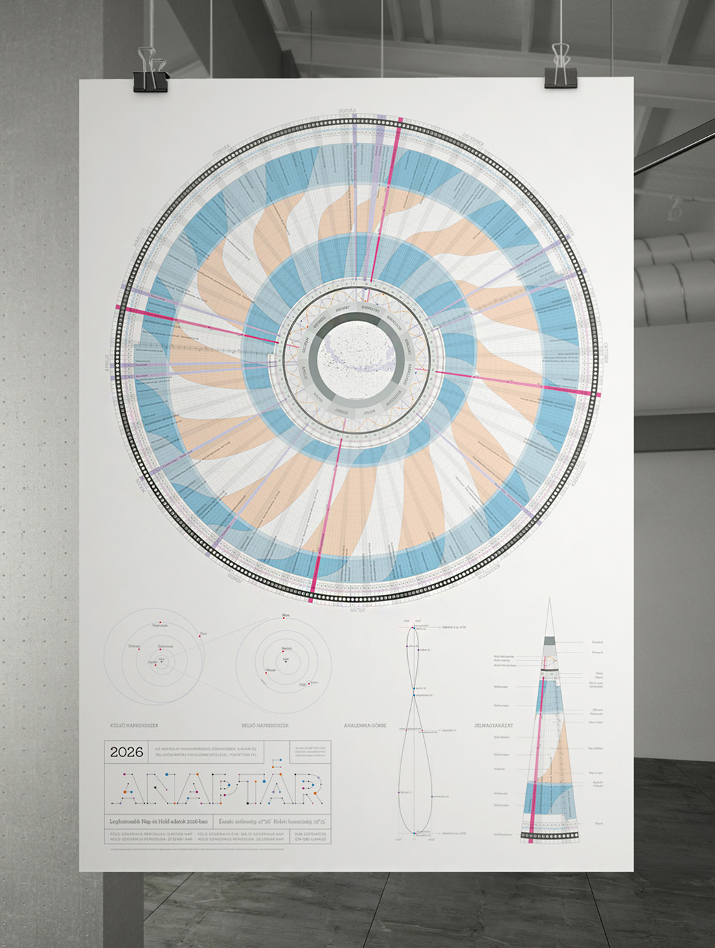 Anaptár is an incredibly detailed, site-specific lunar and solar cycles calendar that not only chronicles the standard annual days and dates, but also takes viewers straight to space with all kinds of astronomical data. The designer was able to come up with a way to visualize data on the Sun and the Moon in a new way. The poster shows the movement of these planets in the sky. For 2026 Anaptár has versions adapted for the geographic locations of Budapest, London, and New York.