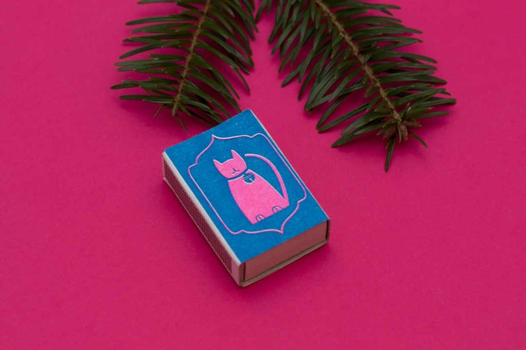 Their latest joined project was done using risograph, a high-speed printing technique massively growing in popularity. A pack of eight matchboxes with each box having a unique illustration on top and a greeting from the group on the back. Also a matching collection of postcards printed on Munken paper was published, both printed with two colors; pink and blue, limitation typical to risograph.