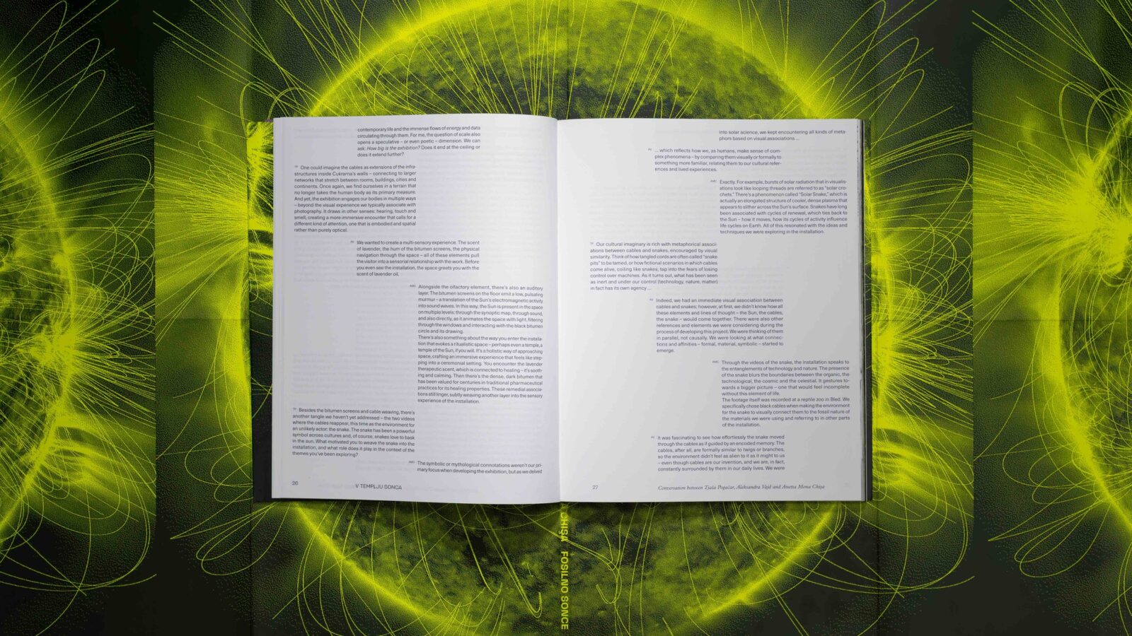 Published by Cukrarna / MGML as part of its exhibition catalogue programme, Fosilno sonce functions as both a record and a conceptual object. It translates the spatial installation into a tactile format, allowing readers to trace the artists’ thinking across ecological, technological, and symbolic registers. Like the exhibition itself, the book invites a slower reading—one that acknowledges the entanglement of human vision with non-human processes.