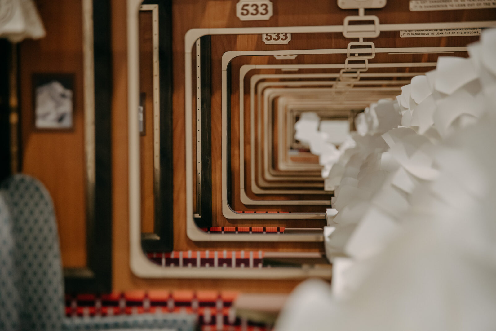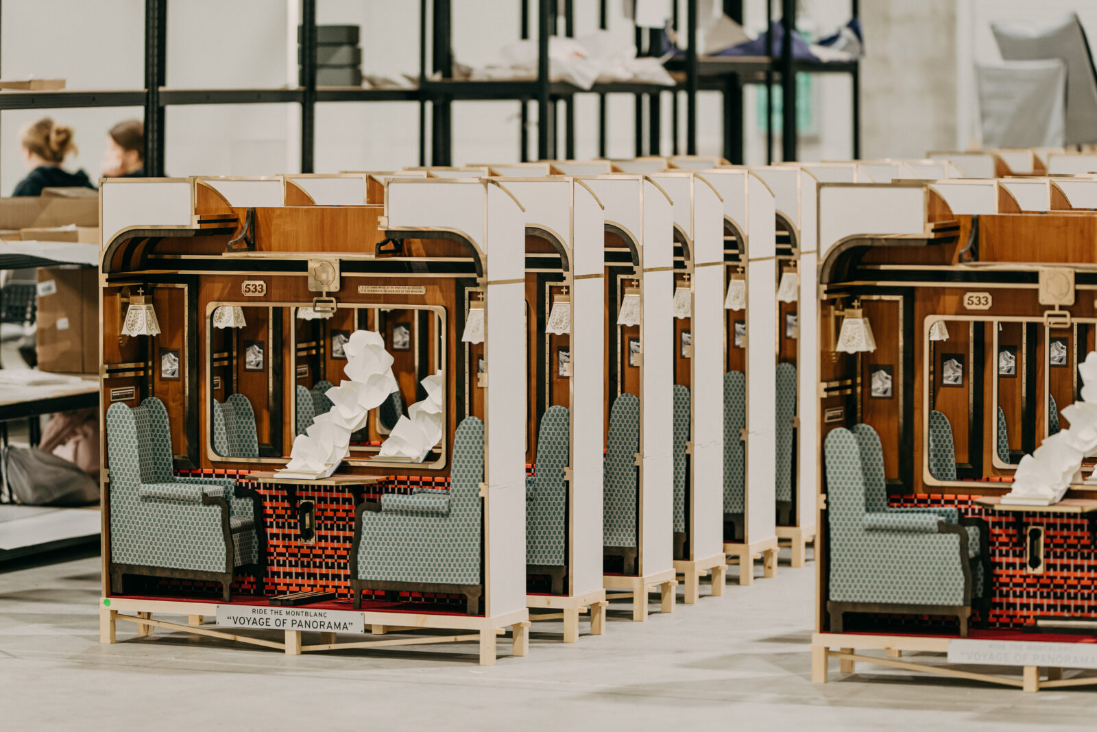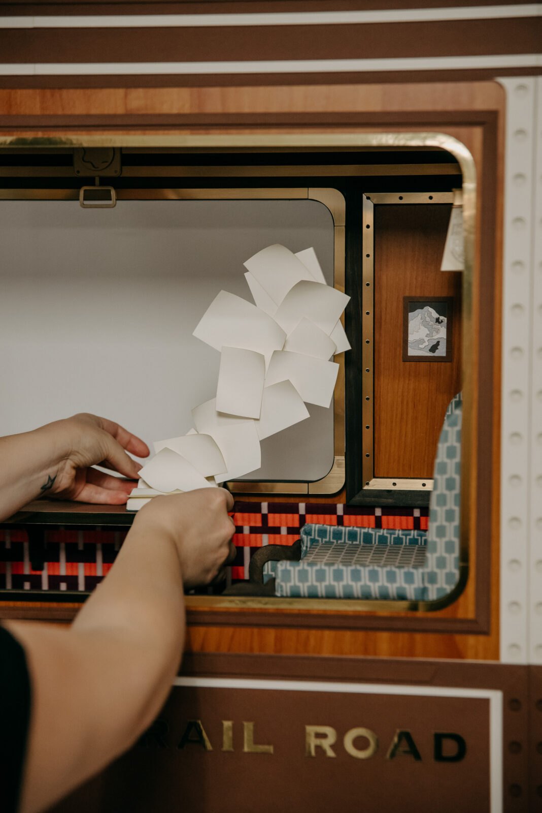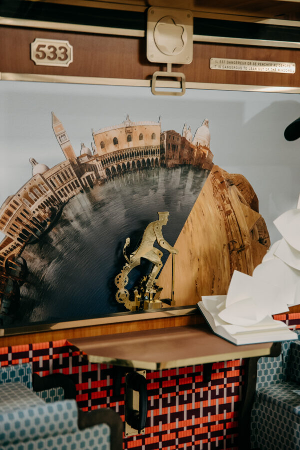 Edinas Paper translated Anderson’s cinematic universe into a tangible installation, with a fully realized paper-and-wood crafted train carriage echoing the Voyage of Panorama.
